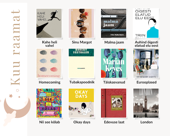 Kuu raamat on mulle kohandatud versioon lugemisväljakutsest, mida internetis mõnel pool kohanud olen. Valisin oma lugemist ootavate raamatute nimekirjast 12 raamatut ja proovin iga kuu ühe läbi lugeda. Mitte ses järjekorras nagu nad siin on, lihtsalt tunde järgi. Üks raamat kuus, mitte rohkem, tagantjärgi mitut ei või võtta. (Noh, et ikka oleks mingid reeglid.)